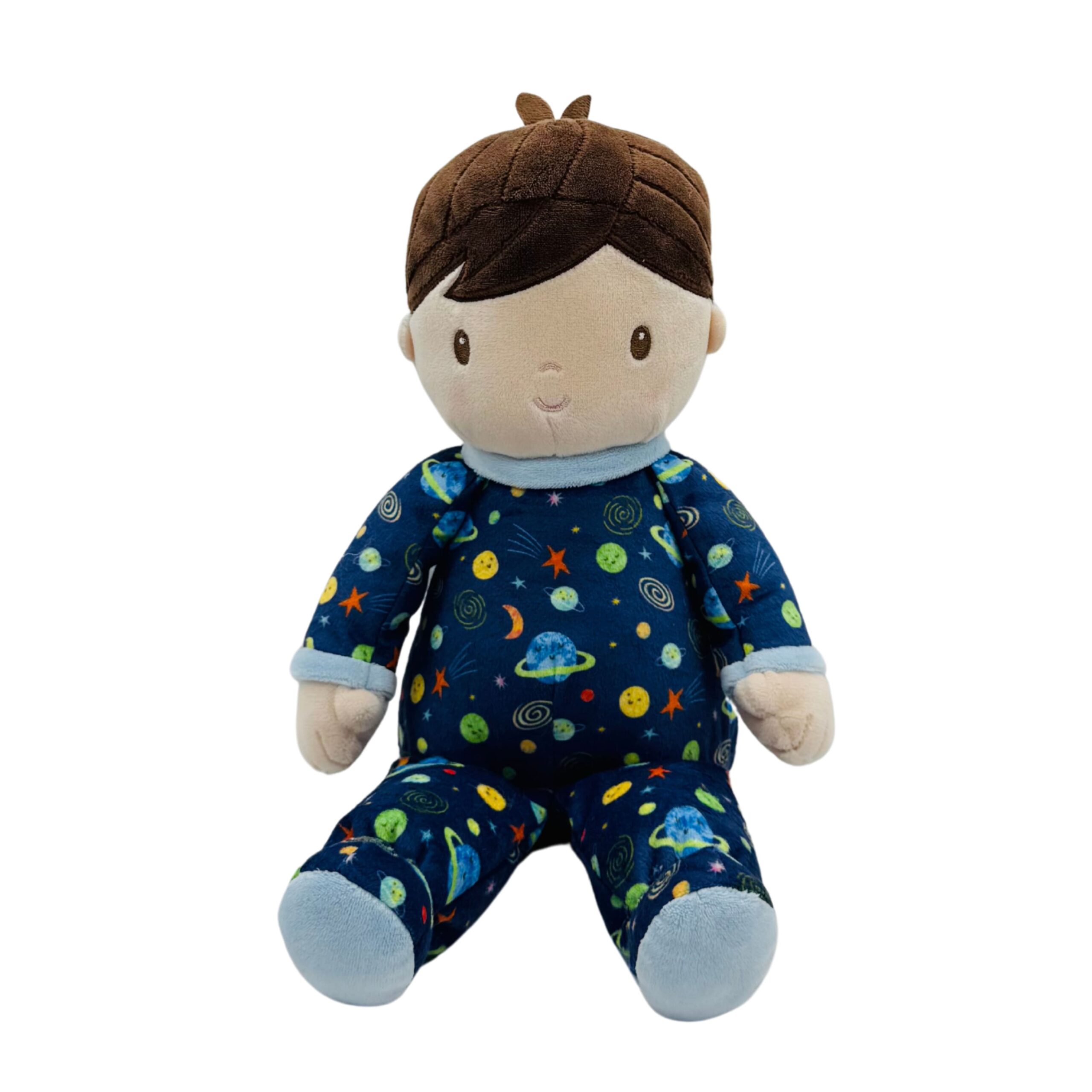Gavin the Galaxy Soft Doll is a cuddly companion dressed in space-themed PJs with stars and planets. Made with quality soft polyester fill, he’s perfect for both play and snuggles. His embroidered details and airbrushed cheeks give him a friendly expression, making him a fun and comforting friend for little ones.