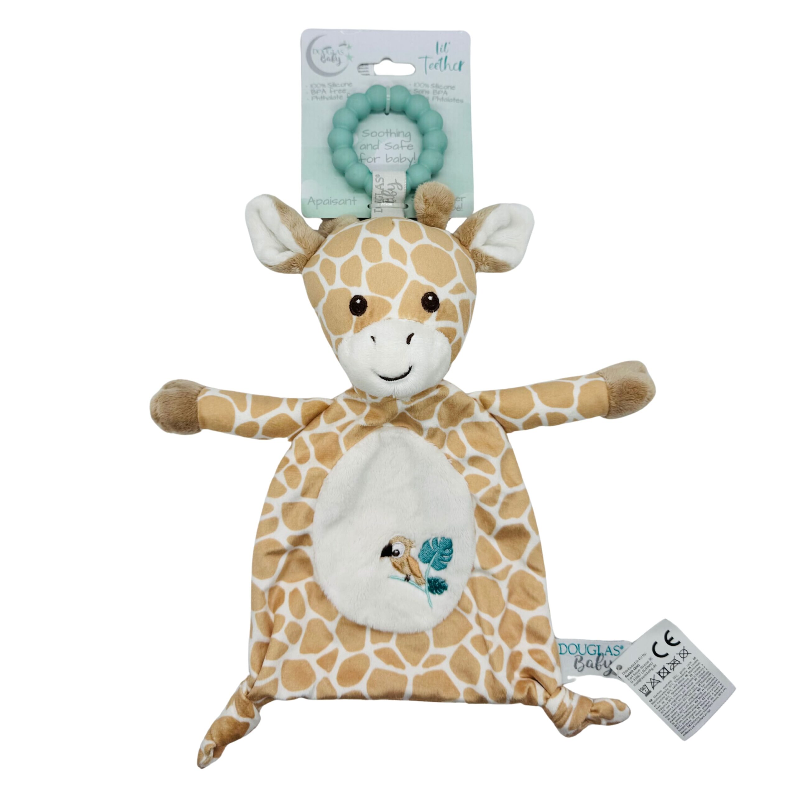 Getting relief from teething pains doesn’t have to be a stretch when Georgie the plush Giraffe Teether is near! Outfitted with a mint green teether ring made from soft and safe silicone, Georgie is the friend Baby needs! With a cuddly plush body, this safari pal will comfort and soothe. Her playful pattern of spots will capture your little one’s attention, while an embroidered embellishment featuring a little bird perched within green jungle foliage adds further charm. Georgie’s smiling expression has been depicted in baby-safe embroidery. Enjoy this Teether on its own or pair with other accessories from our Georgie the Giraffe collection to assemble your own set!