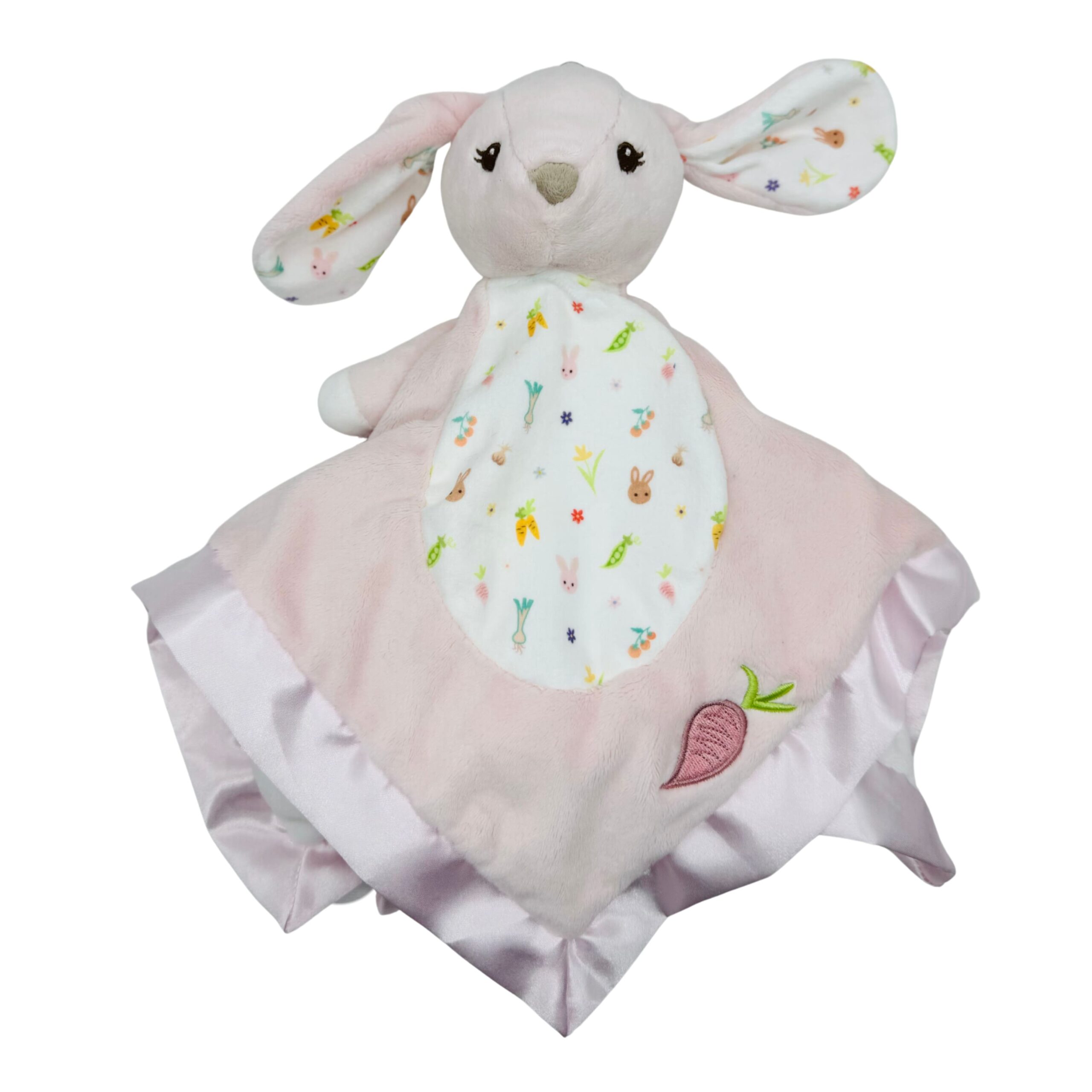 Hop around the garden with Parsnip the Pink Bunny Snuggler! This adorable snuggly bunny is made from a lush combination of velvety plush fabric and silky satin for a feel your baby will love to cuddle! Parsnip’s spring pattern, soft pink color, and floppy ears will be enjoyed by both infants and parents alike.