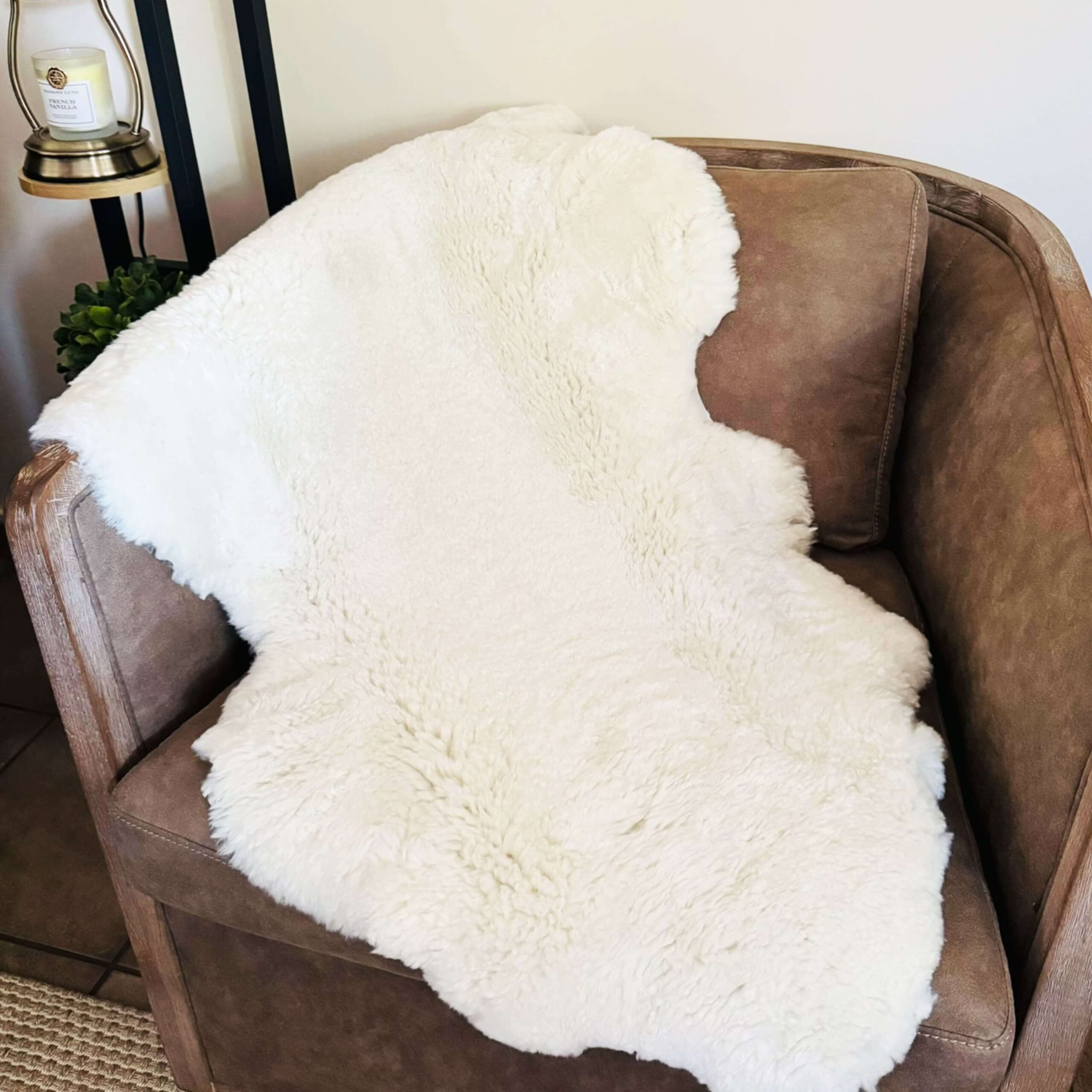Elevate your space with a white 1st-grade Merino sheepskin, known for its thick, luxuriously soft wool and supple hide. Perfect as a statement rug or throw, it adds an extravagant touch to any home interior.